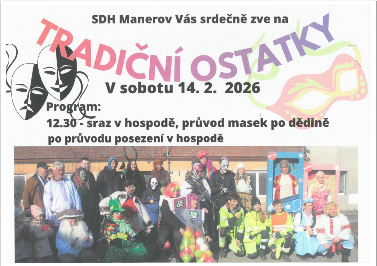 Sbor dobrovolných hasičů Manerov srdečně zve všechny na tradiční Ostatky, které se konají v sobotu 14. února 2026. Sraz účastníků je naplánován na 12:30 v hospodě, odkud vyrazíme na průvod masek po dědině. Po průvodu bude následovat posezení v hospodě.